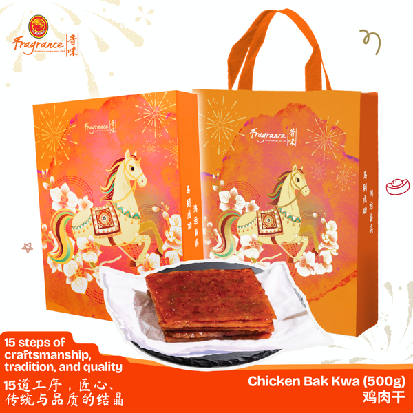 Our Chicken Bak Kwa is made using whole chicken meat, carefully prepared and trimmed to remove skin, excess fats, and connective tissues before slicing. The meat is double-sliced prior to grilling, resulting in a softer, more tender bite.